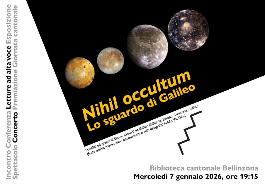 La data del 7 gennaio solitamente non è associata a particolari ricorrenze o eventi, ma in realtà nel 1610 avvenne una scoperta destinata a cambiare completamente il posto dell'uomo nell'universo. Lo scienziato pisano Galileo Galilei, in quegli anni docente presso l'università di Padova, scoprì inizialmente tre satelliti di Giove a cui se ne aggiunse un quarto pochi giorni dopo. L'associazione AMULETI propone una serata di riflessioni su questo importante tema presso la Biblioteca Cantonale di Bellinzona, sempre attraverso i sottili legami tra la musica, la letteratura e l'arte. La serata sarà scandita dalla voce narrante di Alessandro Martin e le letture sceniche di Sara Giulivi che proporranno una selezione di testi a cura della prof.ssa Norma Barbato-Shoufani.